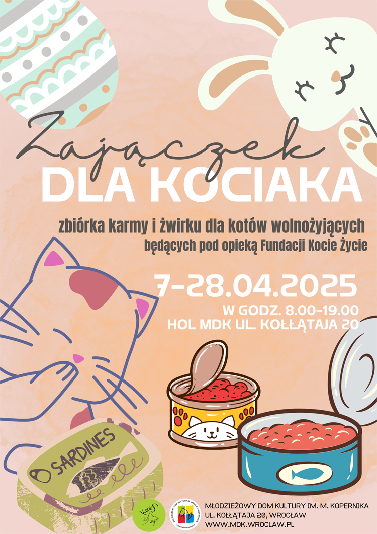 Jak co roku, Młodzieżowy Dom Kultury im. Mikołaja Kopernika serdecznie zaprasza na wielkanocną zbiórkę karmy i żwirku dla kotów wolnożyjących będących pod opieką Fundacji Kocie Życie.