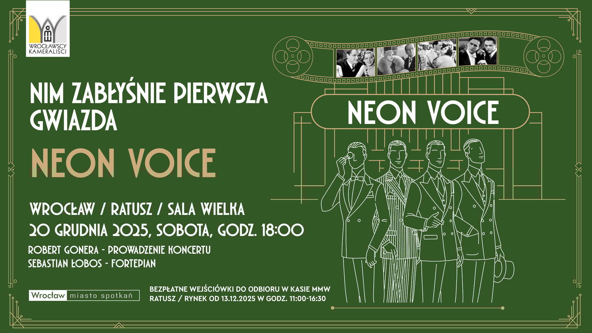 A może warto na chwilę oderwać myśli od tego szumu, pośpiechu oraz krzątaniny? Wrocławscy Kameraliści mają dla Was propozycję na krótki muzyczny odpoczynek. Nic wszak nie koi ludzkiej duszy bardziej niż harmonijne dźwięki melodii znanych i lubianych. Do ich wysłuchania podczas koncertu 20 grudnia w Sali Wielkiej wrocławskiego Ratusza, zaprasza nowo powstały zespół wokalny Neon Voice.