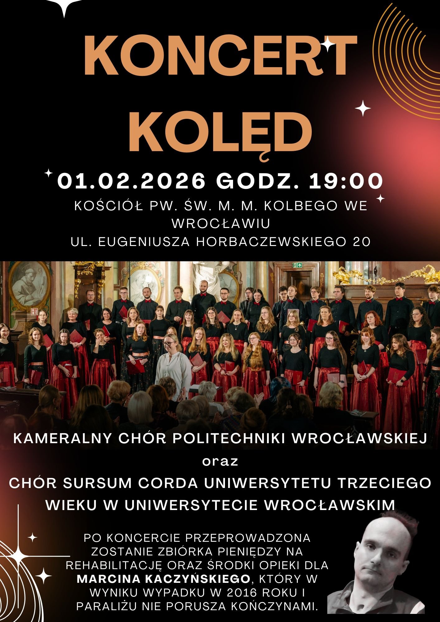 Serdecznie zapraszamy na koncert kolęd, który odbędzie się 1 lutego 2026 roku (niedziela) o godz. 19:00 w kościele pw. św. Maksymiliana Marii Kolbego przy ul. Horbaczewskiego 20 we Wrocławiu.